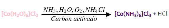 Esto parece deberse a que la oxidación del [Co(NH3)6]2+ ocurre a través de un intermediario, el cual rápidamente reacciona en presencia del catalizador para dar [Co(NH3)6]3+, mientras que en ausencia del carbón la reacción es lenta y el HCl presente interviene en la reacción para dar el primer producto.